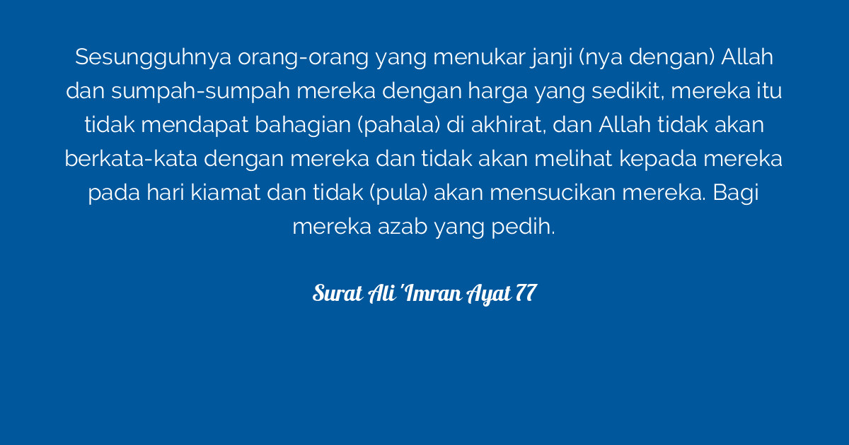 Surat Al Imran Ayat 77 / Surah Ali Imran Ayat 77 Qs 3 77 Tafsir Alquran Surah Nomor 3 Ayat 77 : You can also download any surah (chapter) of quran kareem from this website.. Barang siapa menyuruh manusia menyembah dirinya, berarti ia mengakui bahwa allah mempunyai sekutu yaitu dirinya sendiri. Simak selengkapnya di artikel ini. Read or listen al quran e pak online with tarjuma (translation) and tafseer. Allah will neither speak to them, nor . There shall be no share in the hereafter for those who sell allah's covenant and their oaths for a paltry gain, and on the day of resurrection allah will not .